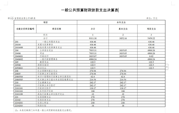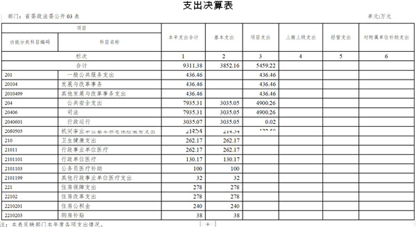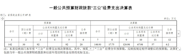 (一)一般公共服务支出:指湖南省委政法委用于开展业务活动所发生的项目支出。行政运行:指湖南省委政法委用于保障机构正常运转的基本支出。一般行政管理事务:指湖南省委政法委机关用于完成相关工作任务发生的项目支出。