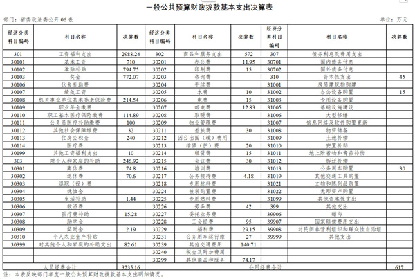 2019年一般公共预算财政拨款基本支出3852.16万元,其中人员经费3235.17万元,占基本支出的83.98%,支出内容主要包括:基本工资、津贴补贴、奖金、其他社会保障缴费、机关事业单位基本养老保险缴费、其他工资福利支出、离休费、退休费、抚恤金、生活补助、医疗费、住房公积金、购房补贴、其他对个人和家庭的补助支出;公用经费支出617万元,占基本支出的16.02%,支出内容主要包括:办公费、水费、电费、邮电费、差旅费、会议费、公务接待费、劳务费、维修(护)费、工会经费、福利费、公务用车运行维护费、其他交通费用、其他商品服务支出。