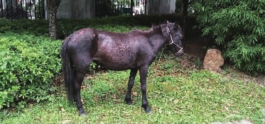 记者小心翼翼刚走到亭子边,警觉的小马立刻挺直身子,眼睛望过来,眼神中满是警惕。小马儿约一个成人高,毛发是棕色的,在与记者进行了漫长的眼神交流后,才稍稍放松,低头自顾自啃了一口地上的青草。也在这时,记者看到,小马儿的额头、颈脖、周身上下有多处伤痕,臀部还有明显的红色印记。