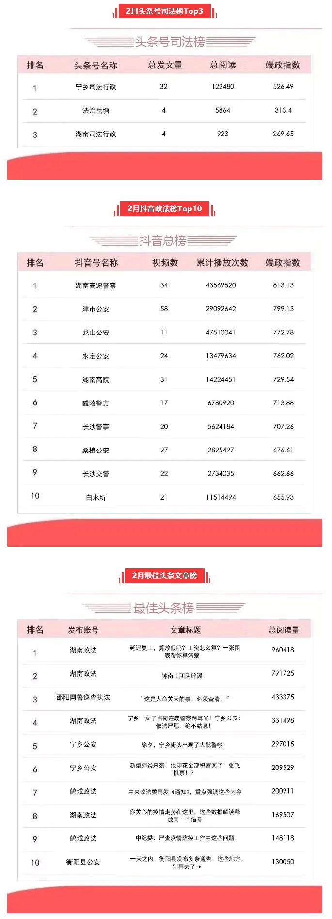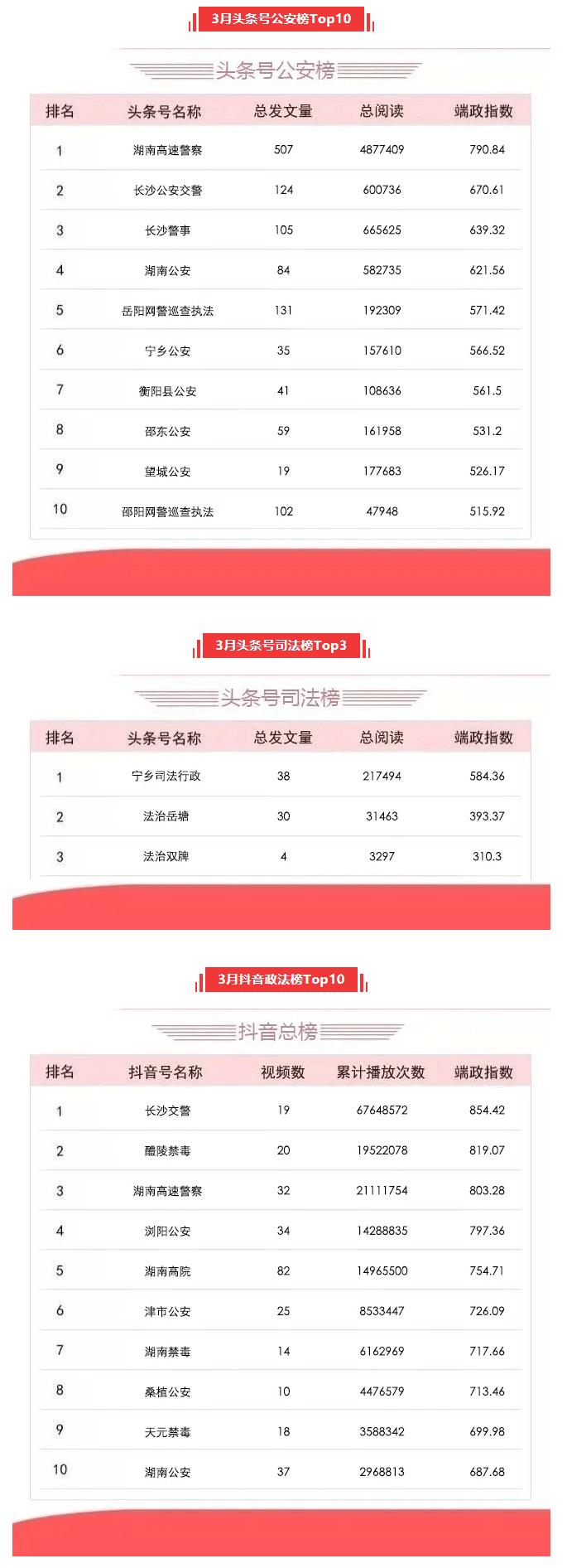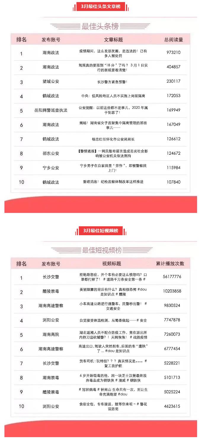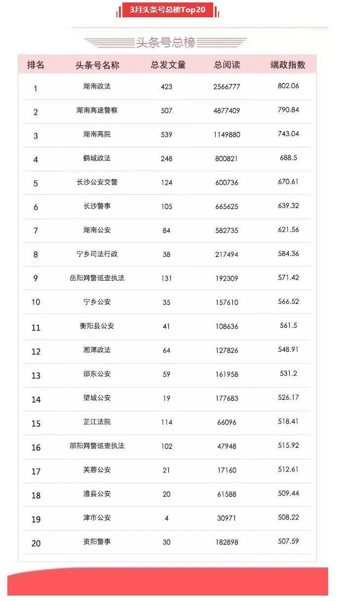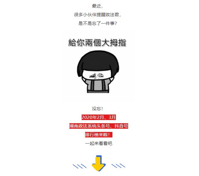 湖南政法系统头条号、抖音号2020年2、3月榜单