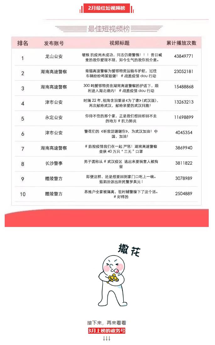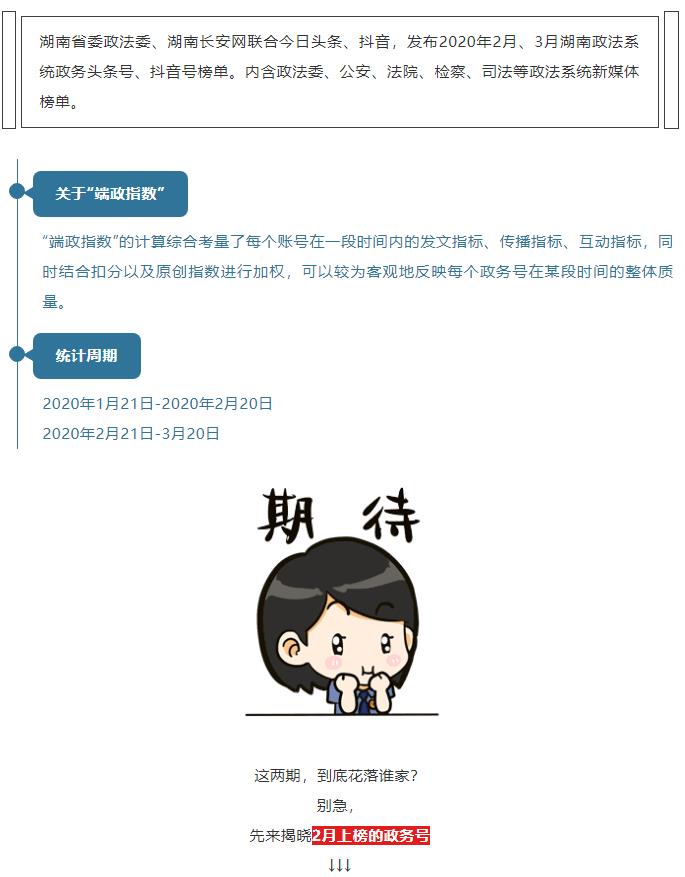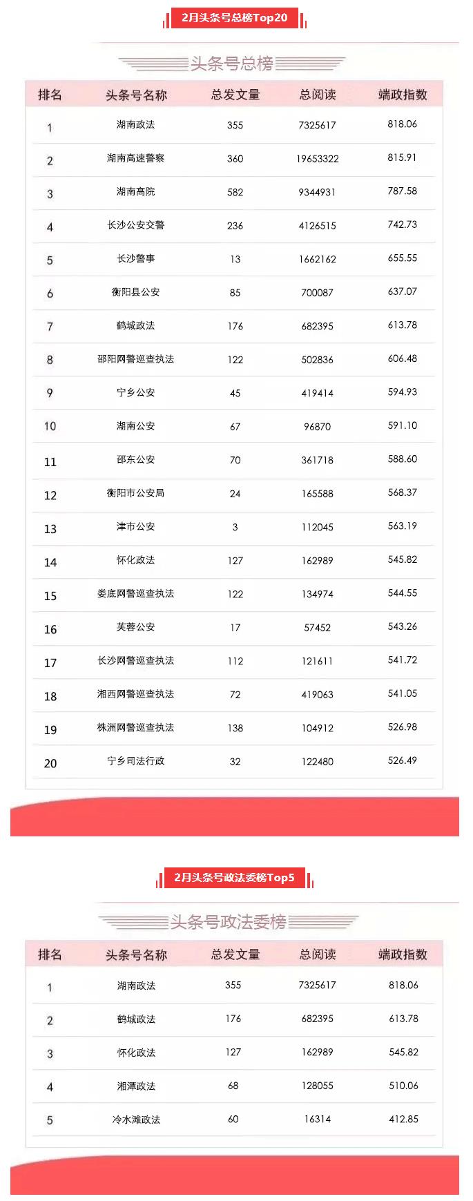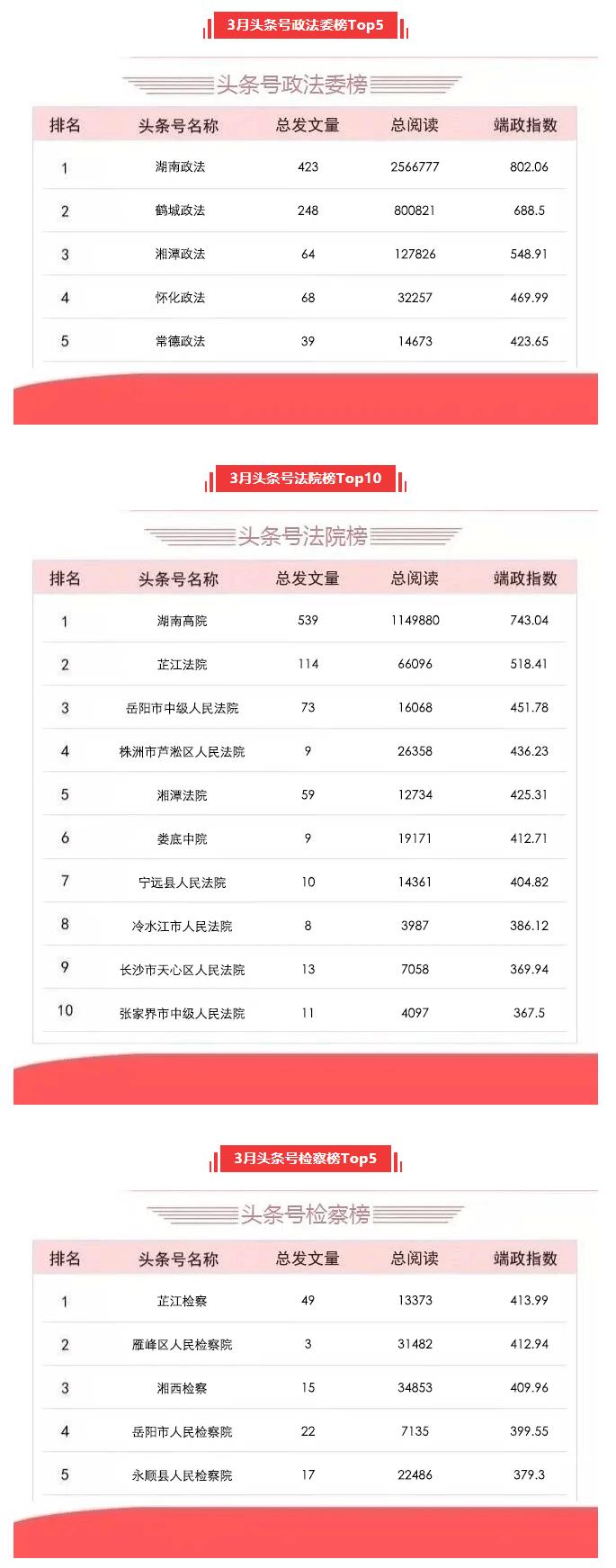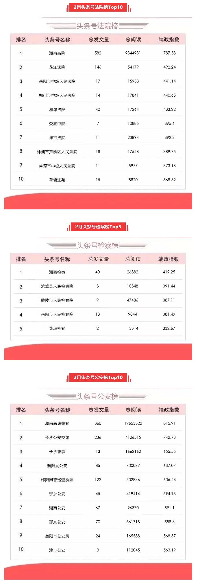 湖南政法系统头条号、抖音号2020年2、3月榜单