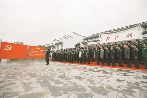 郴州市公安局在“半条被子”故事的发生地——汝城县沙洲村举行党日活动,重温入党誓词。(郴州市公安局供图)