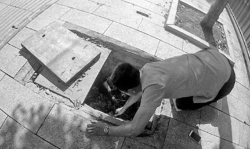 跪地查找窨井盖归属单位