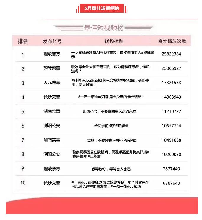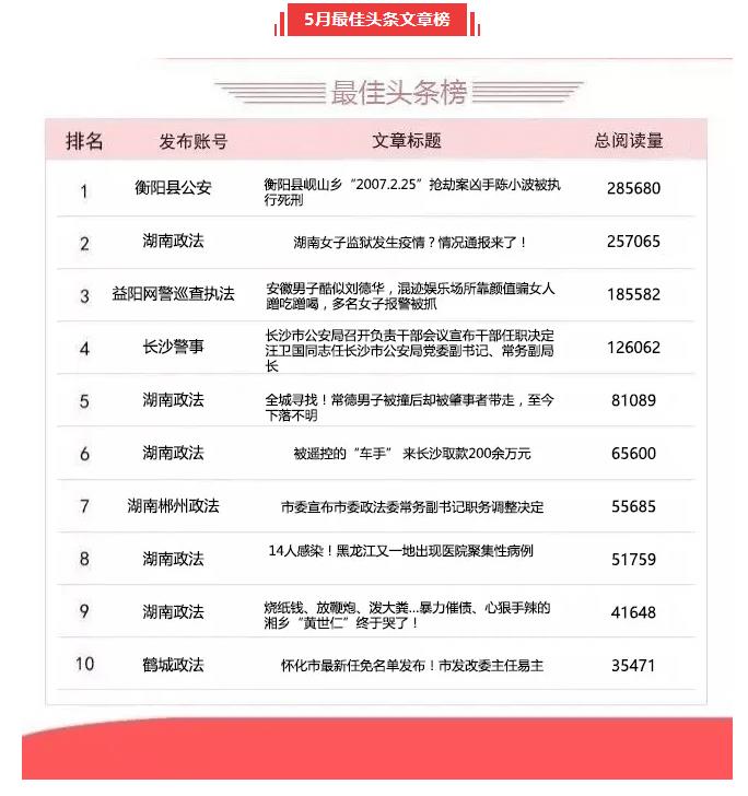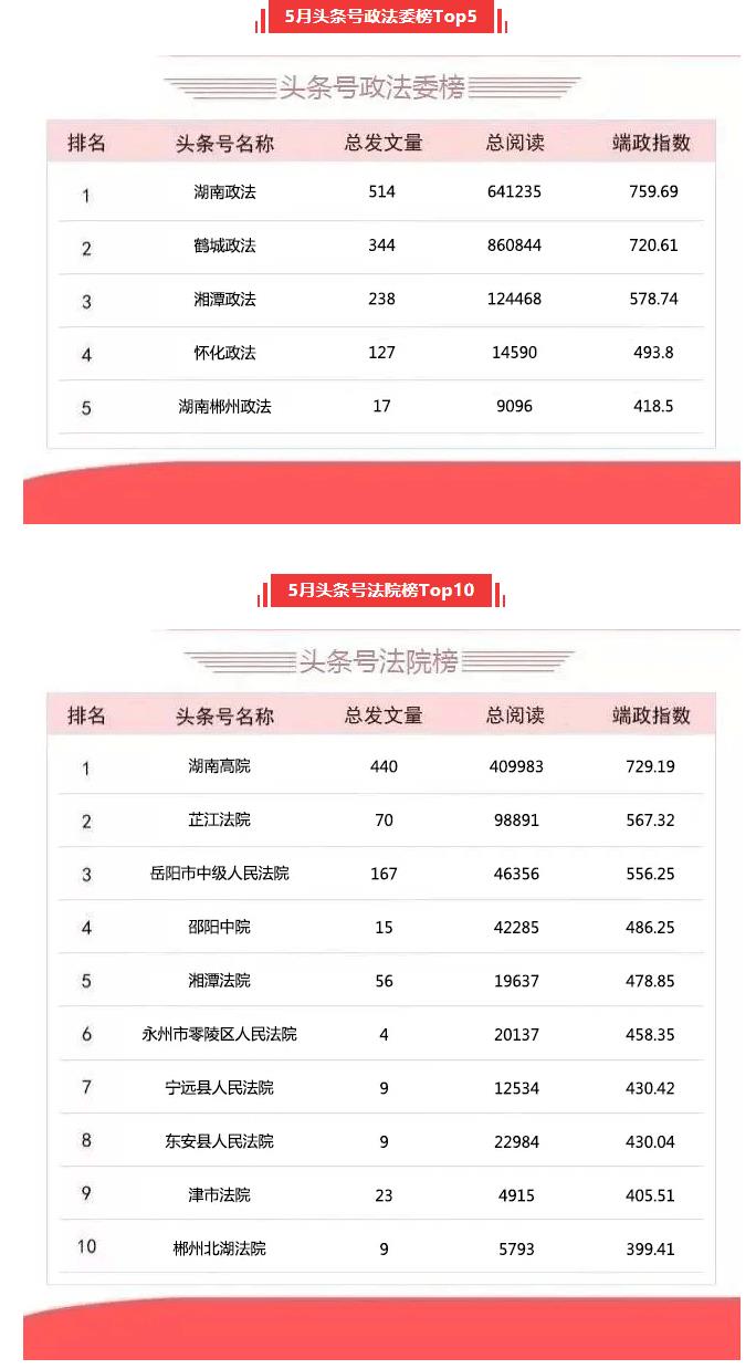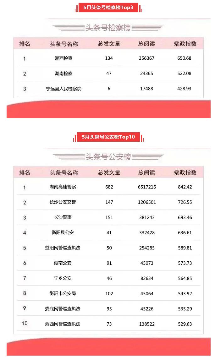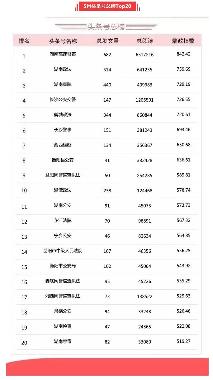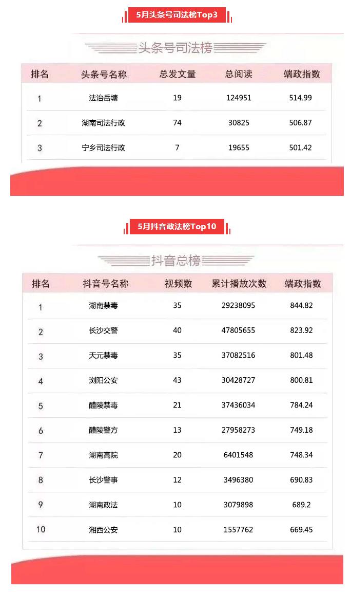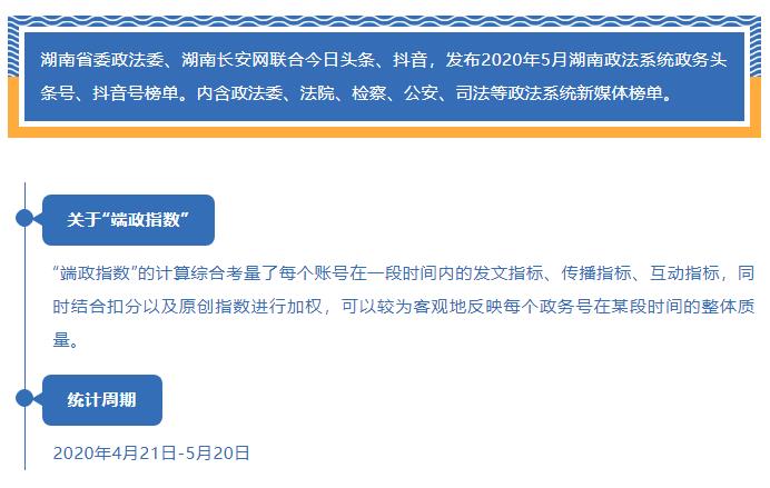 湖南政法系统头条号、抖音号2020年5月榜单