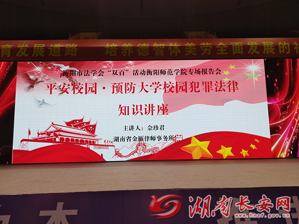 文章来源:湖南长安网 作者: 时间:2018-09-30 16:23:249月28日晚,由衡阳市法学会主办,珠晖区法学会承办的“百名法学家百场报告会”法治宣讲活动衡阳师范学院专场在珠晖区大学城篮球馆内举行。珠晖区法学会法学专家、珠晖区人大代表、湖南金雁律师事务所主任佘珍君应邀作专场报告。衡阳师范学院副院长陈敏主持报告会,衡阳市法学会秘书长邹光耀、珠晖区委政法委副书记、珠晖区法学会副会长刘国国出席,衡阳师范学院师生5000余人参加了报告会。