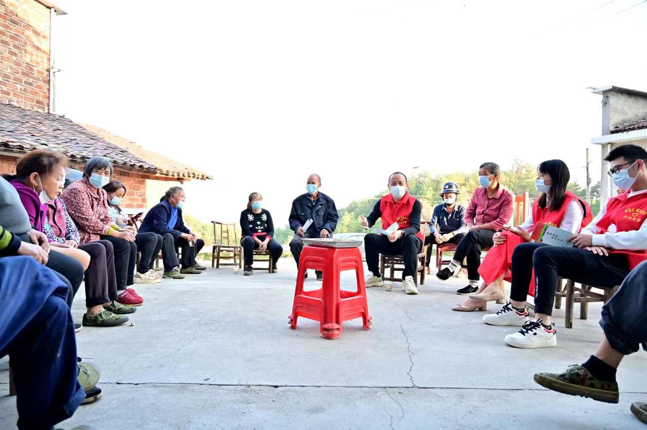 “和森红”志愿者充分利用屋场会,宣传疫情防控、森林防火、安全生产等中心工作(李建新/摄)