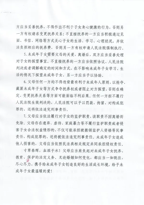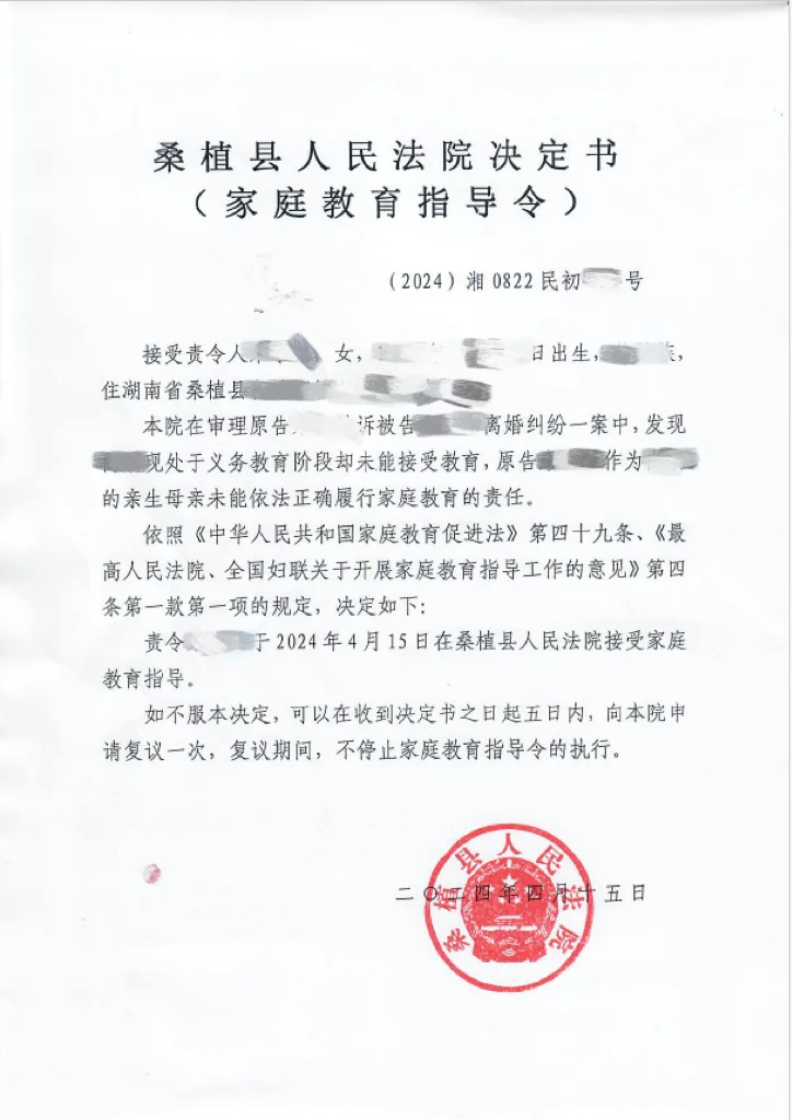 文章来源:桑植县法院 作者: 时间:2024-04-17 11:18:254月15日,最高人民法院发布了《关于在涉及未成年子女的离婚案件中开展“关爱未成年人提示”工作的意见》(以下简称《意见》)。当天,桑植县人民法院适用该《意见》,就朱某某与向某某离婚纠纷一案发出了关爱未成年人提示卡,并针对朱某某的不当行为发出家庭教育指导令。