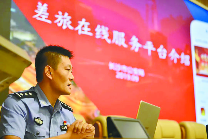 杨挺向基层民警辅警介绍差旅在线服务平台。