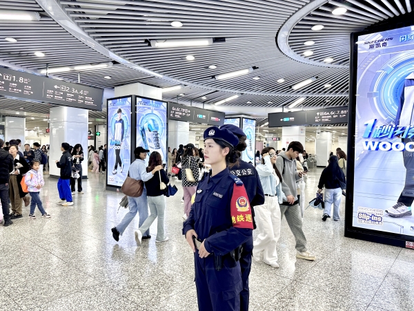 长沙市公安局公交治安分局民警在地铁口执勤。