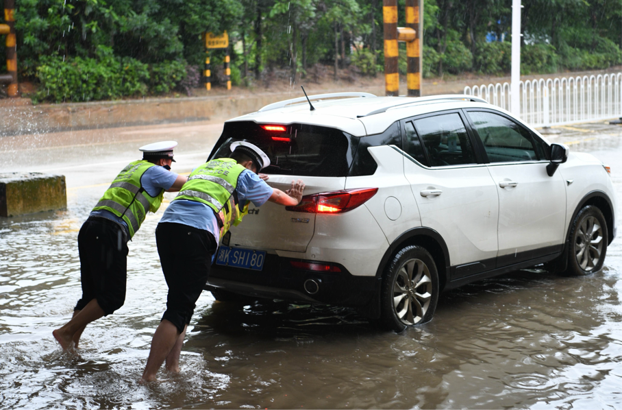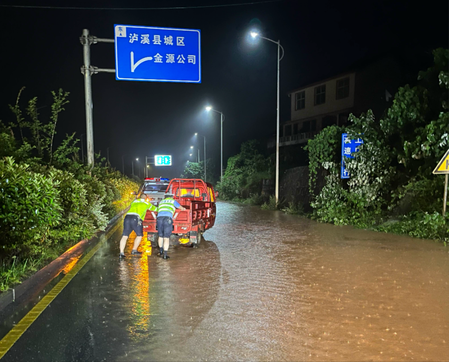 泸溪公安交警大队在路面巡查时,发现白武公路一辆三轮车因积水太深抛锚后,民辅警冒着暴雨推车将三轮车转移至安全地带。
