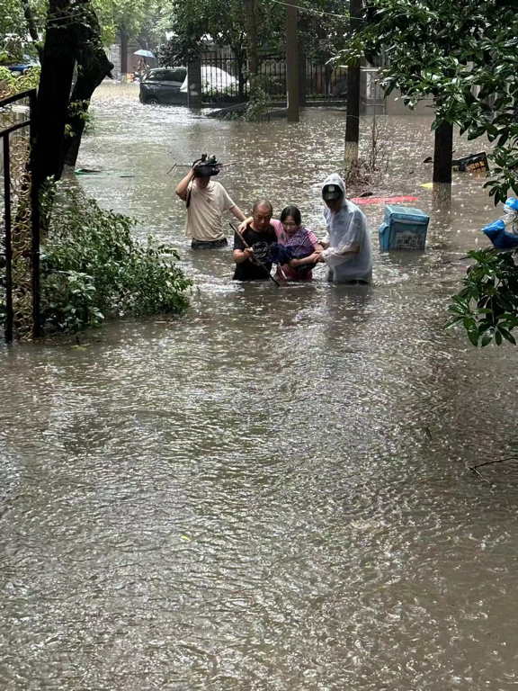 6月24日上午,长沙市芙蓉区朝阳街道二里牌社区向韶村28栋因暴雨造成积水。长沙市公安局芙蓉分局朝阳街派出所社区辅警何功铭协助群众安全转移。