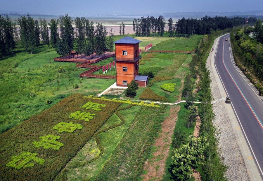 这是2022年8月10日拍摄的位于河南省三门峡市的黄河生态廊道(无人机照片)。