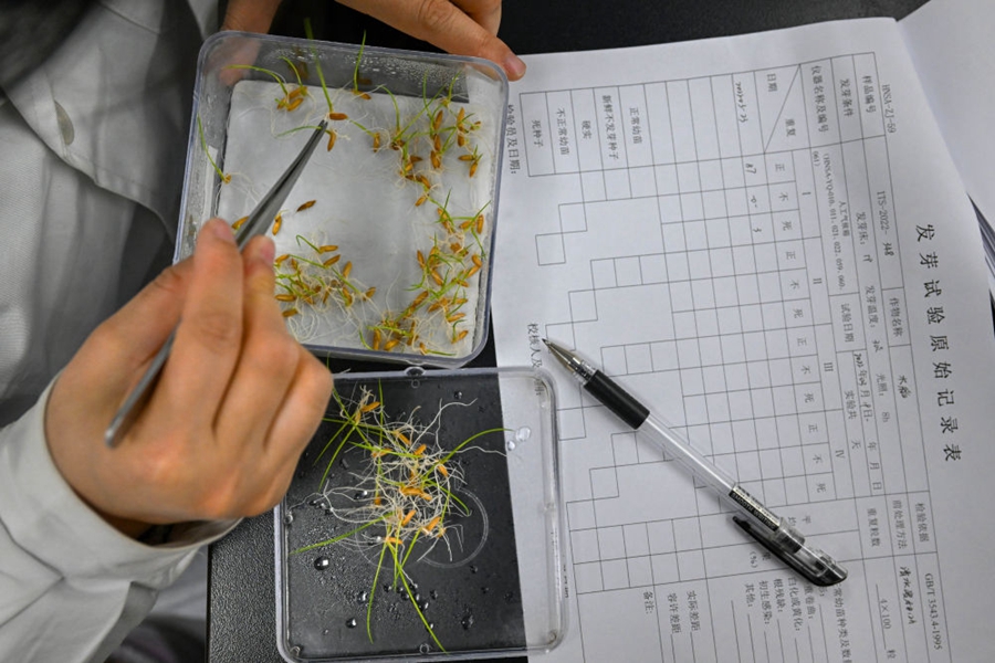 2022年3月23日,在湖南省农作物种质资源库实验室,检测员对保存的水稻种子进行发芽试验检测。