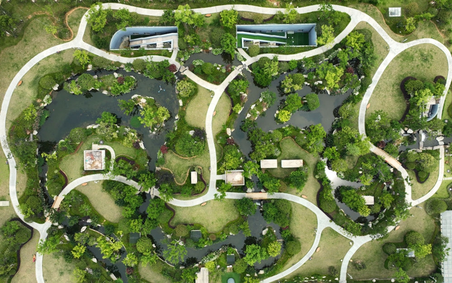这是2023年6月15日拍摄的以“地上花园 地下治污”设计理念建设的九江市双溪公园(无人机照片)。近年来,江西省九江市启动中心城区水环境综合整治工程,通过地下污水治理、岸线生态修复、兴建“公园式”污水处理厂、城市智慧管网管控等措施,改善水环境,城市面貌焕然一新。