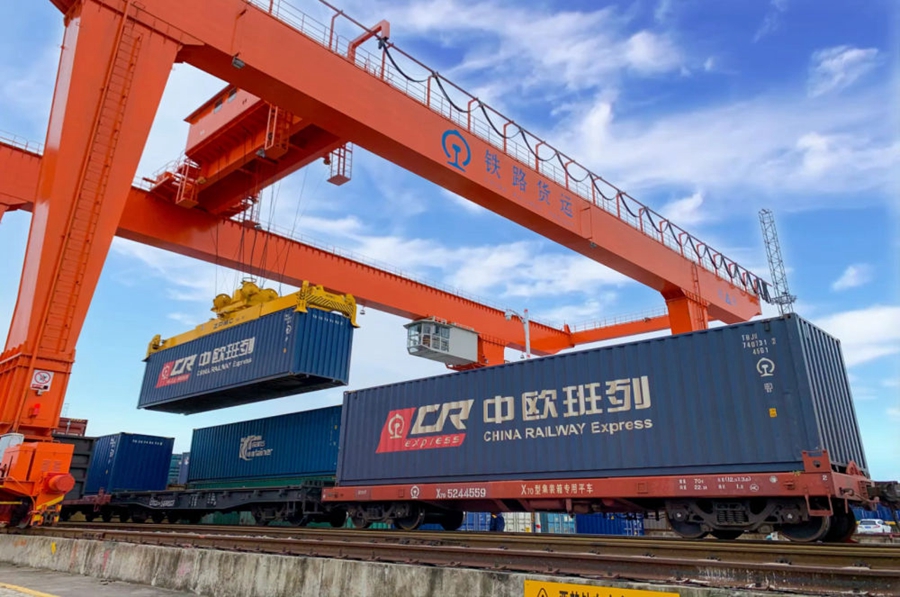 2022年4月29日,在铁路合肥北站物流基地集装箱作业区,龙门吊吊装准备发运的中欧班列集装箱。
