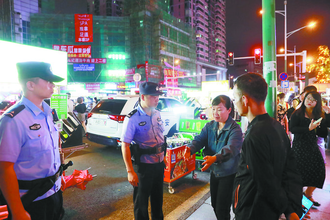 22时05分,值班民警熊斌接到警情提示,有小吃摊位阻挡消防通道。熊斌带上辅警邹鹏飞马上赶赴现场,发现一名男子正和一名小吃摊摊主理论。