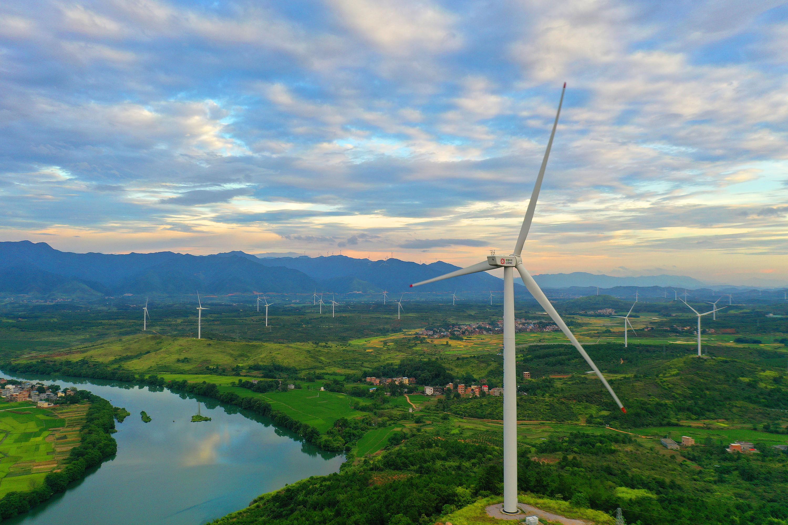 △ 湖南省永州市的风力发电风车与蓝天、绿水、田野交相辉映,构成一幅美丽的生态画卷。
