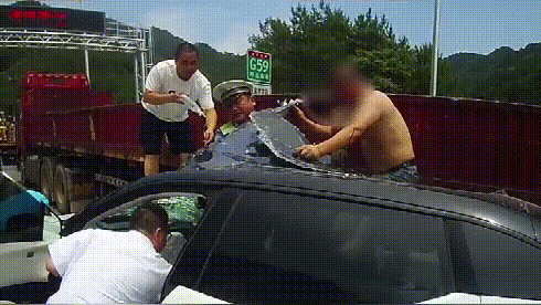 民警用自己的肩膀硬生生地将断裂的前挡玻璃框架顶起,另外两名群众负责将破损的挡风玻璃掀开以免再次扎伤伤者。经过警民的携手努力,伤者被成功救出。事后,民警才发现手已被玻璃划破。