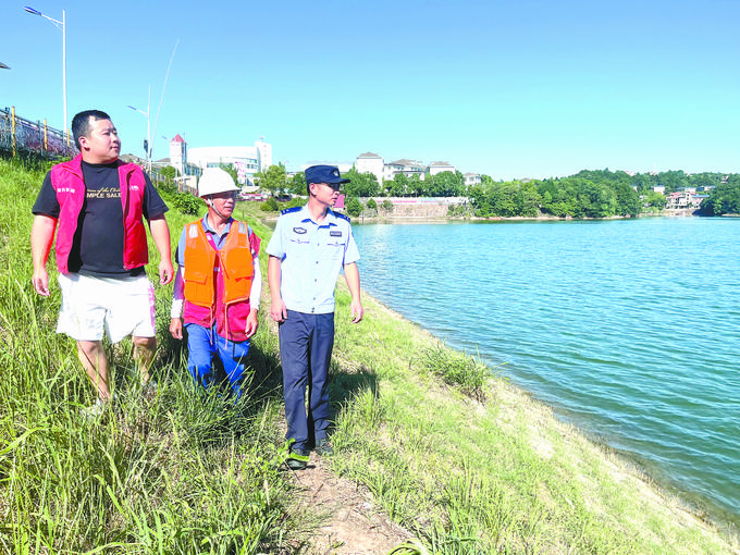 张含带领志愿者在辖区河道沿岸开展巡逻。