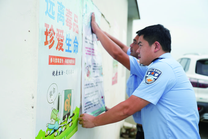 赵勇和同事在辖区张贴禁毒和防溺水宣传海报。