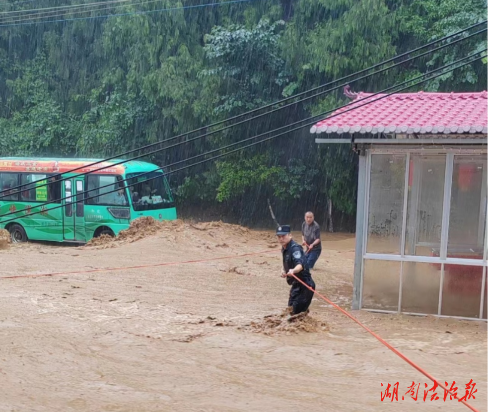 6月30日清晨,保靖突将特大暴雨,高达316.9mm的降雨量打破以往历史记录。通宵值班后,向鹏所在的2中队本该到了换班休息时间,但以城区龚家湾为主的多个地区,陆续出现了严重受灾情况。事关群众生命安危,命令在不久后便传到,所有队员取消休息,即刻前往一线抗洪救灾。与此同时,全局各个部门警种也相继奔赴灾情最前沿。