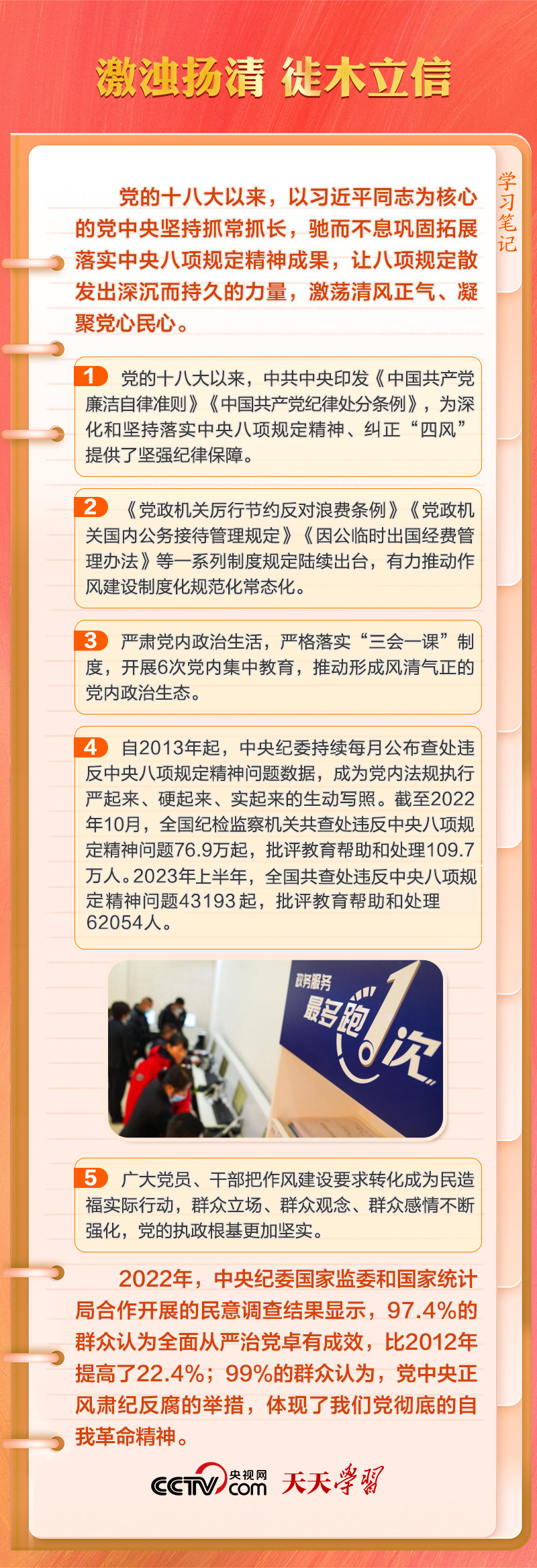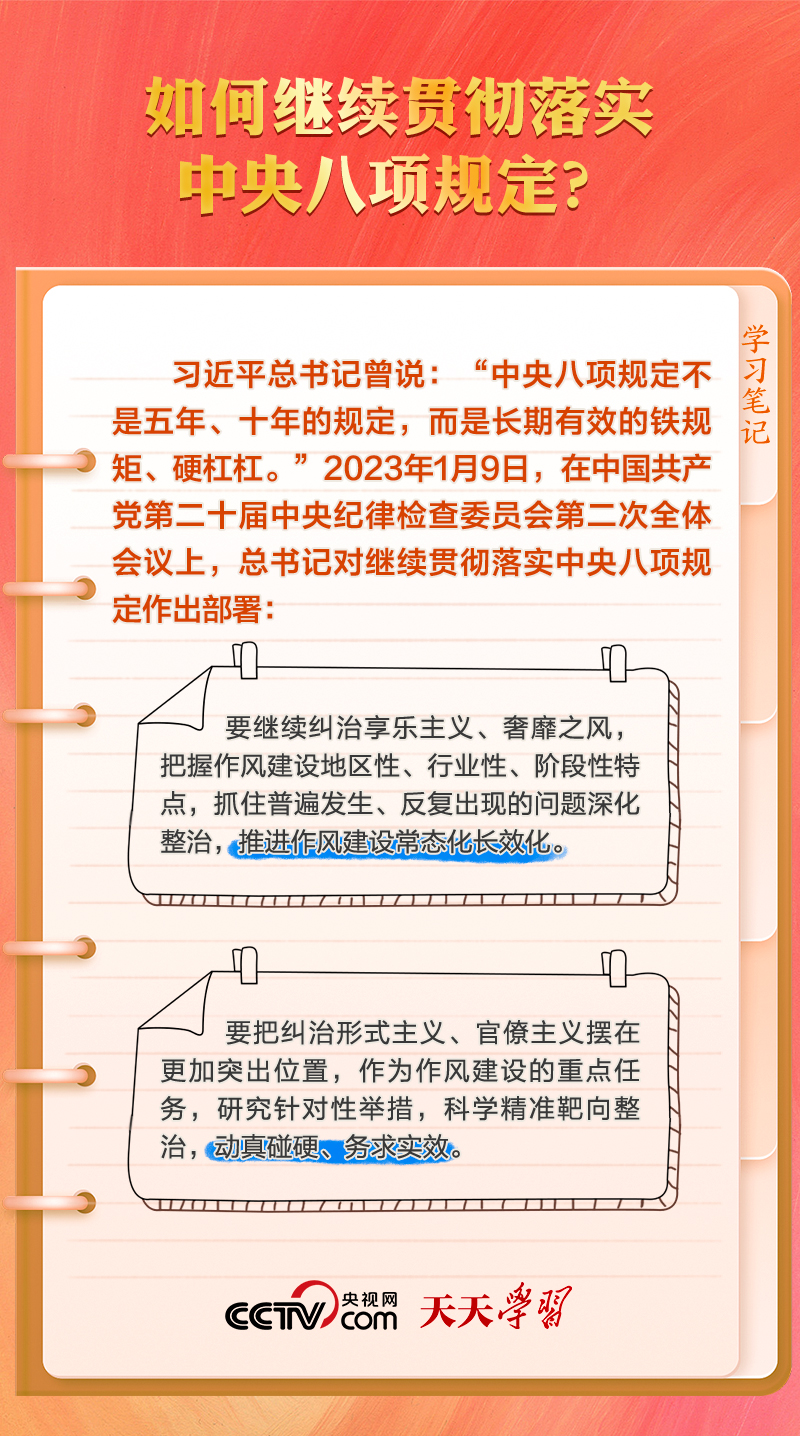 文章来源:央视网 作者: 时间:2024-01-06 20:13:50在二十届中央纪委二次全会上,习近平总书记指出:“制定实施中央八项规定,是我们党在新时代的徙木立信之举,必须常抓不懈、久久为功,直至真正化风成俗,以优良党风引领社风民风。”