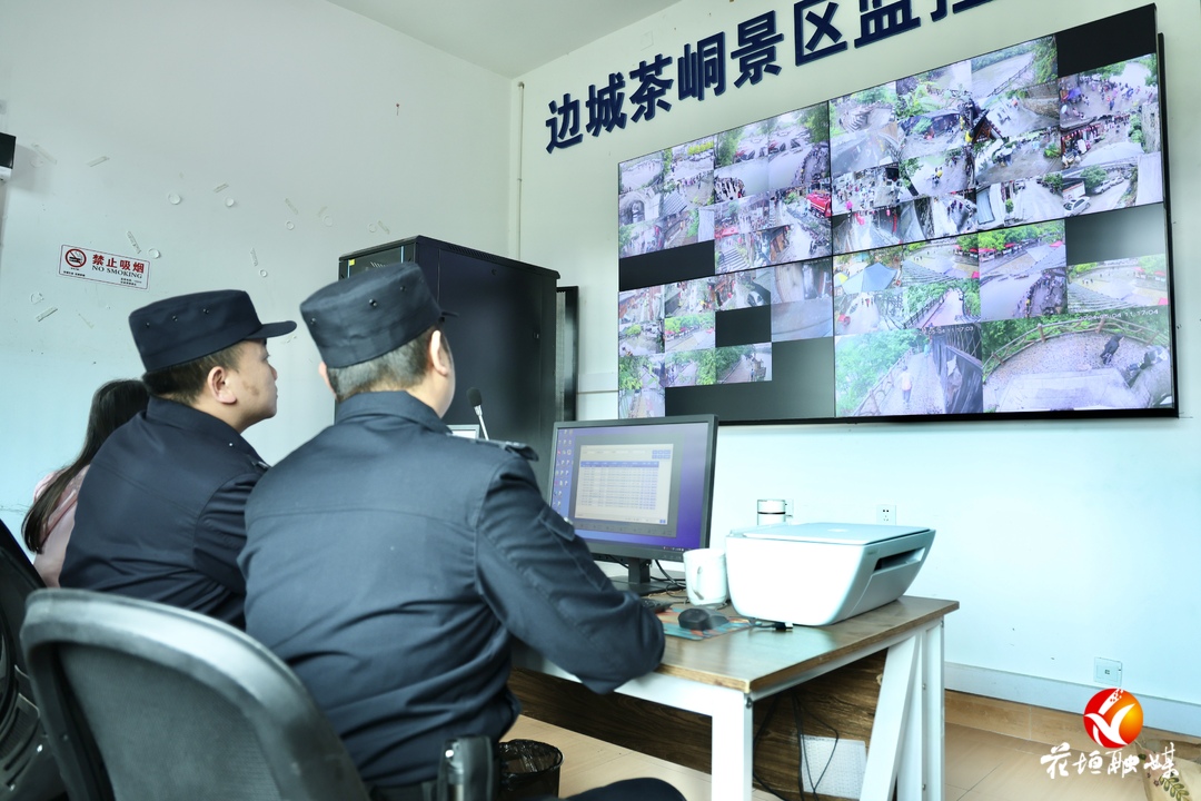 在游客服务中心视频监控室里,民警正在认真查看监控,排查景区安全隐患