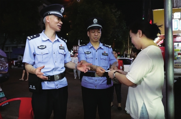 金谷中心警务室民警在夜巡时向群众发放警民联系卡