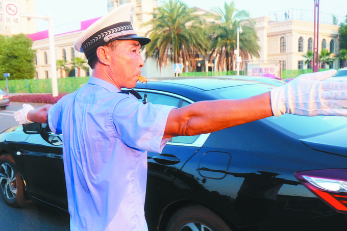 炎炎夏日,曾祥富在常德市城区芷兰路口用“口哨交通指挥五步曲”进行交通指挥。